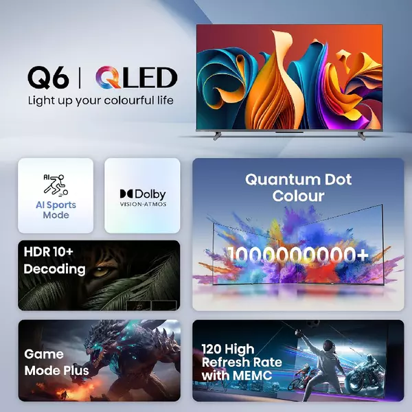 The Hisense 50Q6N is a 50″ QLED 4K Smart TV featuring Quantum Dot Color for vibrant visuals, 4K AI upscaling, Dolby Vision and Atmos for cinematic quality, Game Mode PLUS for enhanced gaming, and a 120Hz refresh rate for smooth motion. It runs on the VIDAA Smart TV platform with voice control capabilities.