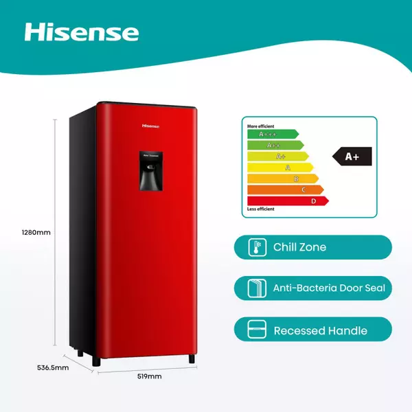 Hisense Refrigerator 177L Single Door, Water Dispenser, Chiller Zone, Anti Bacteria Door Seal, Recessed Handle, Red H235RRE-WD