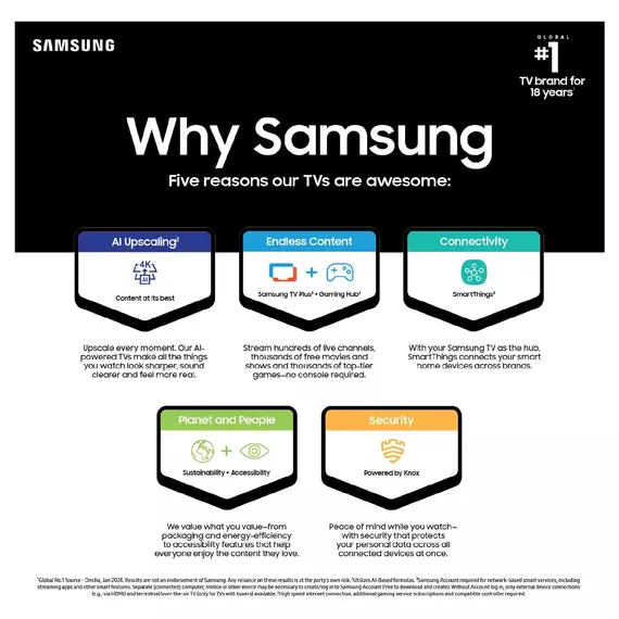 * Content and service may vary by region and are subject to change without notice. * Agreement to Smart Hub Terms and Conditions and Privacy Policy is required before use.* Some content and services require registration and subscription.* (Except for China, Turkey, Israel) Requires Samsung account to access the full range of Samsung Tizen OS features including the smart TV features and apps. If you choose not to login-in, you will only be able to connect to terrestrial TV(applicable to devices with tuners only) and external devices, e.g. via HDMI. You may need a separate device (e.g. PC or mobile) to create a Samsung account.